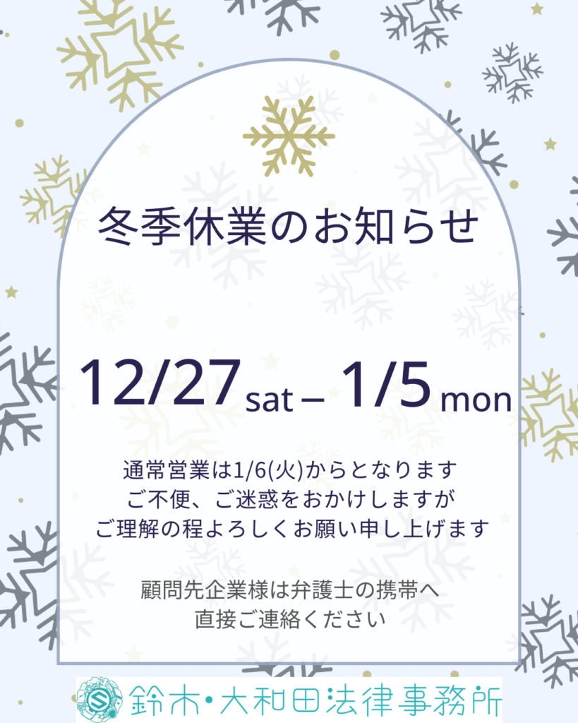 鈴木・大和田法律事務所では、令和7年12月27日(土)から令和8年1月5日(月)までの間、冬季休暇とさせていただきます。